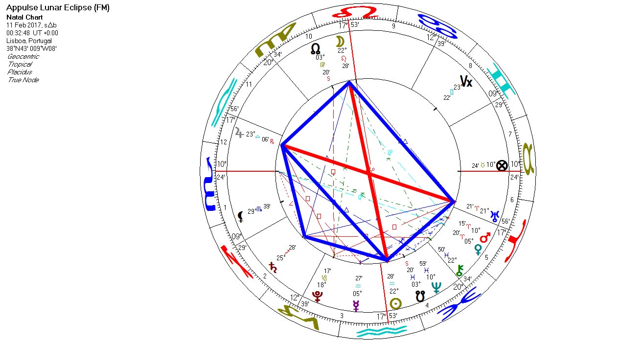 É nesse sentido que estas duas oposições (Lua-Sol e Júpiter-Úrano, os traços vermelhos em destaque na imagem) são envolvidas num bloco que é chamado de quadrado místico, pois, na verdade, estes quatro planetas, entre eles, para além das oposições, estão envolvidos, como pode ser visto pela imagem, nos traços azuis em destaque, por aspectos fluídos, simpáticos e potenciadores, mostrando-nos que quando conseguimos separar-nos das diferenças e unir os pontos, sabemos criar pontes e eliminar as barreiras, ou os muros, se quisermos ser mais actuais.