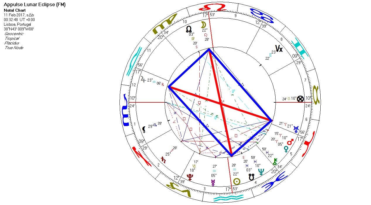 Se o Sol representa a nossa energia consciente e a Lua o seu complemento, o inconsciente, então, num eclipse, o que temos presente é a filtragem dum pelo outro. Num eclipse da Lua, o Sol, o consciente, coloca-se à frente do inconsciente, permitindo-nos ver o que antes estava guardado, apagado ou escondido, como uma luz que direccionamos para um poço profundo. A questão que se coloca é, afinal, o que poderemos aqui encontrar neste eclipse. O Eclipse dá-se no eixo Leão-Aquário, com a Lua em Leão e o Sol no seu complemento, Aquário, onde não se sente muito confortável. Em oposição ao Sol, a Lua emerge na sua totalidade e brilho, a face mais plena da Lua Cheia, reflectindo a luz do Sol em todo o seu espectro.